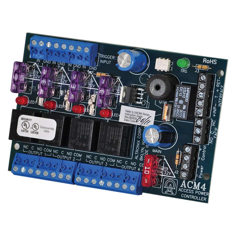 Altronix ACM4 converts one (1) 12 to 24 VAC or VDC input into four (4) independently controlled fuse protected outputs. These power outputs can be converted to dry form "C" contacts. Outputs are activated by an open collector sink or normally open (NO) dry trigger input form an Access Control System, Card Reader, Keypad, Push Button, PIR, etc. ACM4 will route power to a variety of access control hardware devices including Mag Locks, Electric Strikes, Magnetic Door Holders, etc. Outputs will operate in both Fail-Safe and/or Fail-Secure modes.