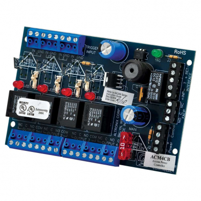 Altronix ACM4CB converts one (1) 12 to 24 volt AC or DC input into four (4) independently controlled Class 2 PTC protected power-limited auto-resettable outputs rated at 2A each. Outputs are activated by an open collector sink or normally open (NO) dry trigger input form an Access Control System, Card Reader, Keypad, Push Button, PIR, etc. The ACM4CB will route power to a variety of access control hardware devices including Mag Locks, Electric Strikes, Magnetic Door Holders, etc. Outputs will operate in both Fail-Safe and/or Fail-Secure modes.