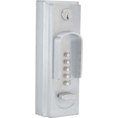 The Simplex 2015 Mechanical pushbutton lock provides exterior access by combination, while allowing free egress at all times by interior Exit Device (not supplied). This fully mechanical lock eliminates the material and labor expense of battery replacements, has a single access-code and is programmed via the keypad without removing the lock from the door.