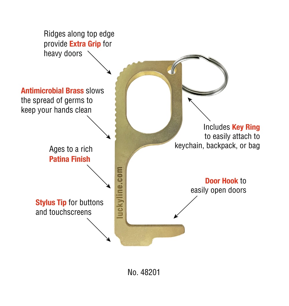 - Hands-free door hook and flat stylus tip to easily open doors or push buttons without ever touching surfaces.