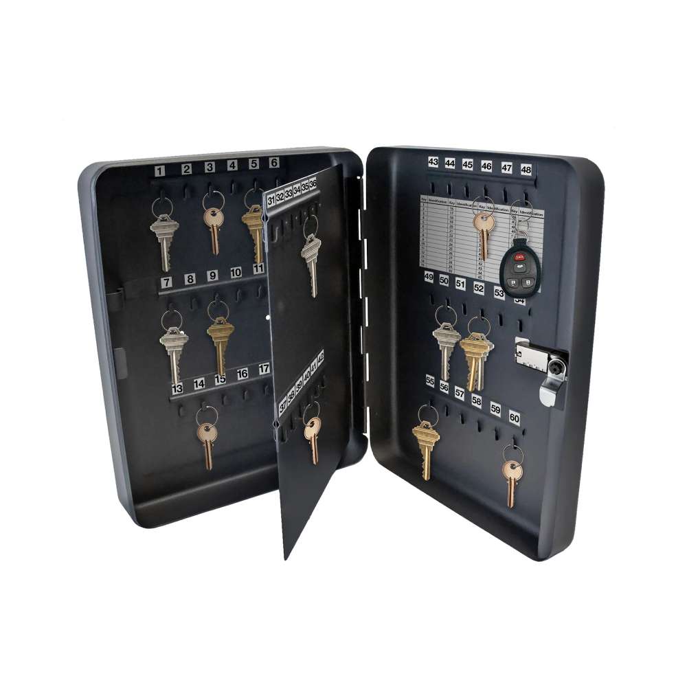 This cabinet features a locking door to restrict access to authorized users and includes key rings and identification labels to simplify key organization. Pre‑drilled mounting holes and included hardware allow for easy wall installation in offices, schools, apartment complexes, and fleet operations.