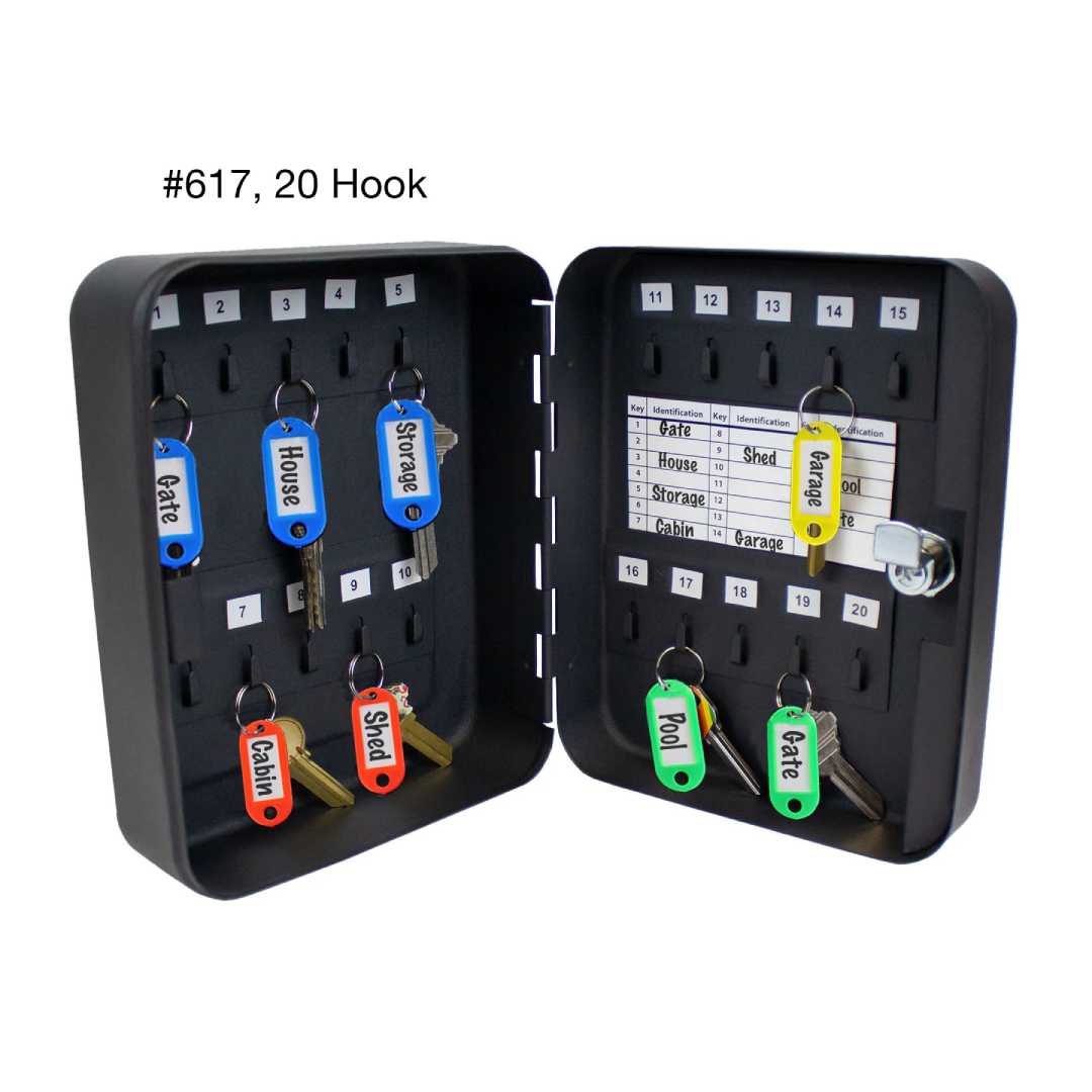 Featuring 20 hooks, the cabinet includes key rings and labeling tags to help identify and organize keys efficiently. A lockable door helps restrict unauthorized access, making it ideal for property management, maintenance departments, and other professional environments where organized key control is essential.