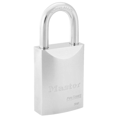 The Master Lock No. 7041 ProSeries® Solid Body Padlock features a 1-3/4in (44mm) heavy hardened steel body with chrome rustproofing and a 1-3/16in (30mm) tall, 5/16in (8mm) diameter hardened boron alloy shackle for superior cut resistance. Padlock is available with or without core with choice of 16 Small Format Interchangeable Cores to match this padlock to your door locks. Designed for commercial/industrial applications.