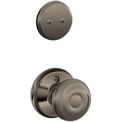 Finish: The Schlage Georgian Knob Interior Pack comes in Brass (605), Satin Brass (608), Antique Brass (609), Satin Nickel (619), Antique Nickel (620), Distressed Nickel (621), Matte Black (622), Polished Chrome (625), and Aged Bronze (716) finish.