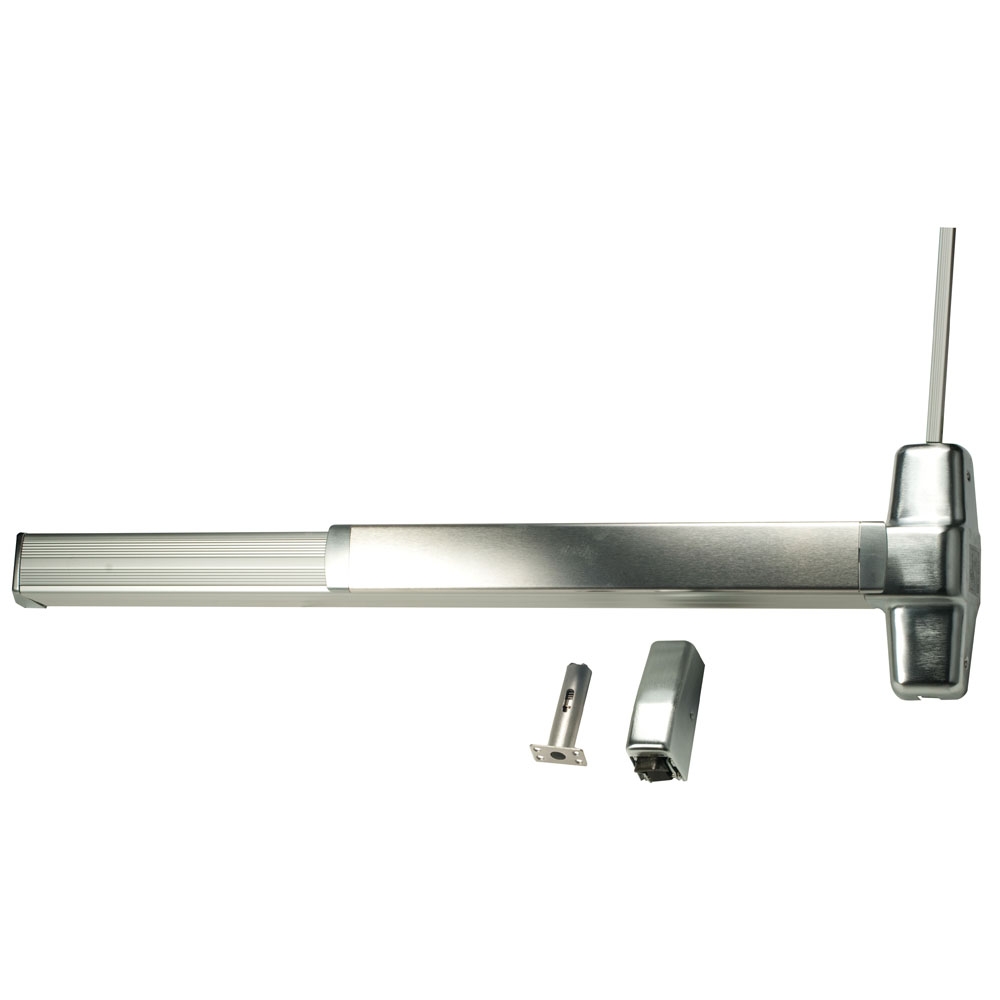 Von Duprin exit device trim for 98/99 series rim and vertical rod devices. The 996EO Exit Only Plate Trim is one of the standard trims for the 98 and 99 series Von Duprin panic bars. It is an exit only plate trim which means there is no handle or opening mechanism. This does not allow entry through the door once you exit.