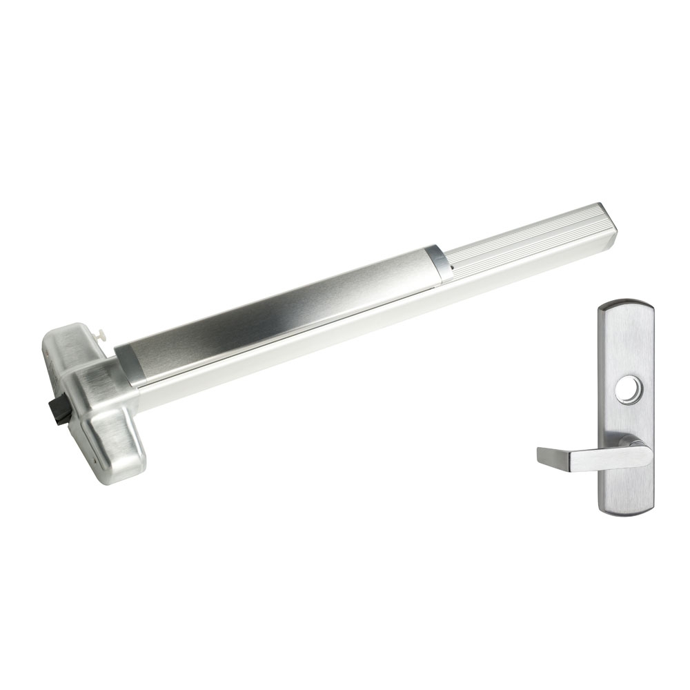 Heavy-duty exit devices with grooved mechanism cases for all types of single and double doors.