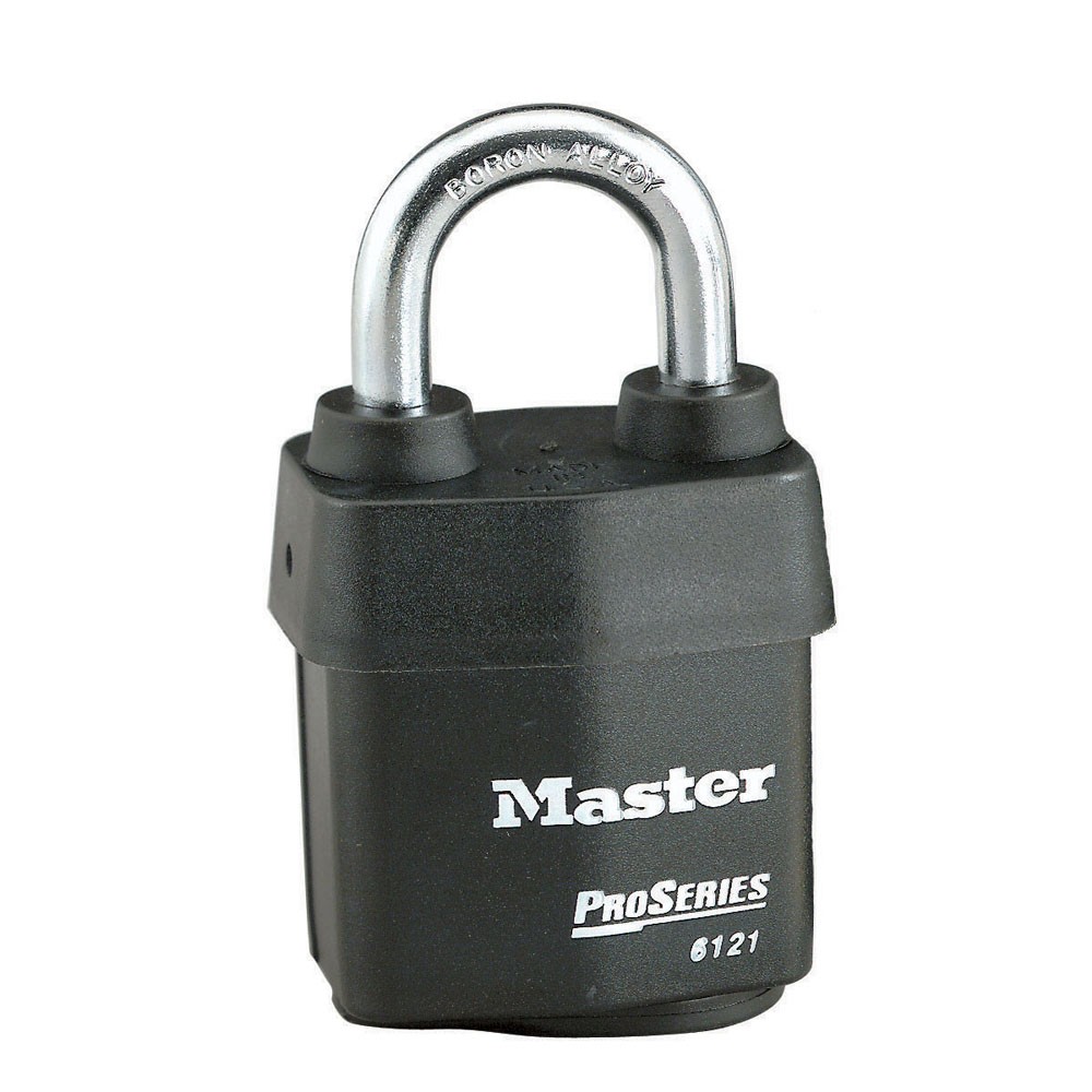 The Master Lock 6121, 6125, 6127 ProSeries® Weather Tough® Covered Laminated Padlocks feature a wide heavy steel body to withstand physical attack and a hardened boron alloy shackle for superior cut resistance. The exclusive cover protects these padlocks from harsh elements.