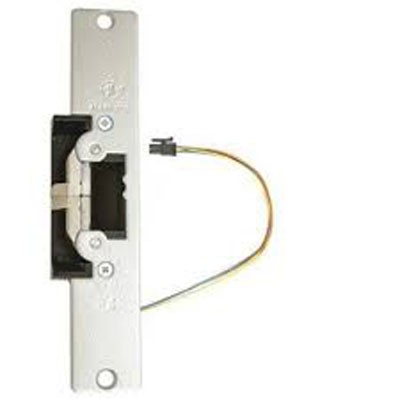 This non-handed strike features an ultra-compact design and adjustable stainless steel keepers with over 1,500 lbs [680.4 kg] of holding force in fail secure mode. The strike releases electrically with up to 25 lbs of door preload. Single solenoid operates on 12/16/24 VDC power. Remote electrical control of narrow stile aluminum doors equipped with an Adams Rite 4500, 4700 (discontinued), or 4900 Deadlatch or cylindrical lockset with 1/2" [12.7 mm] to 5/8" [15.9 mm] latchbolt projection. Electrical actuation unlocks the keeper, releasing the latchbolt so the door may be opened without operating the latch itself.