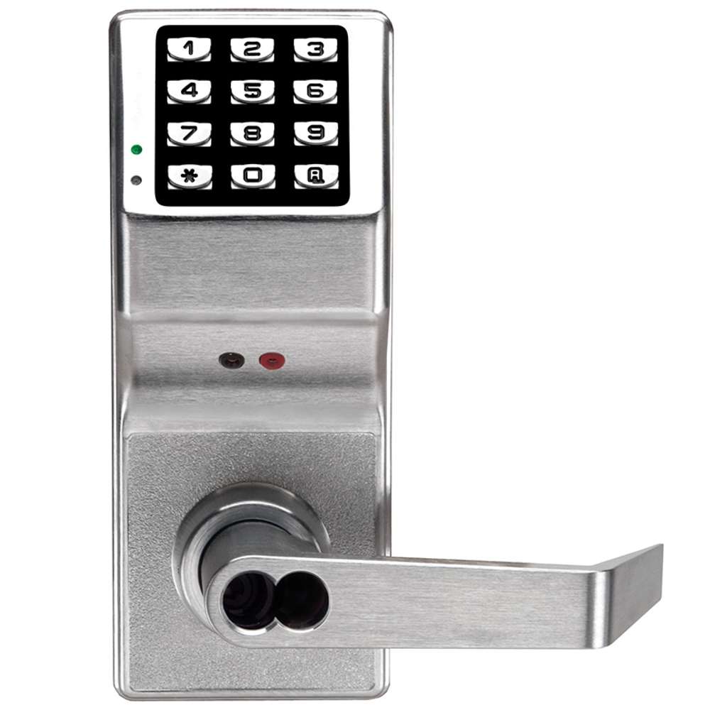 The Alarm Lock DL2875IC-US26D Pushbutton Cylindrical Door Lock is one of the most popular standalone pushbutton cylindrical door locks. It is a non-handed lever lock that is easily installed and has a great amount of versatility. It is battery operated with AA batteries, which allows it to operate independently, but it can also work with a group or total multi-level user lockout codes. It accommodates up to 200 different user codes of 3 to 5 digits each, and the keypad is fully programmable itself. It is all metal with 12 buttons total. This cylindrical door lock also features an audiovisual entry indicator on the front.