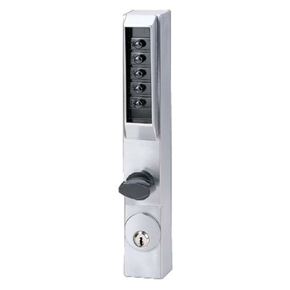 The Simplex 3000 Series mechanical pushbutton lock provides exterior access by combination for narrow stile aluminum glass doors. This fully mechanical lock eliminates the material and labor expense of battery replacements, has a single access-code and is programmed via the keypad without removing the lock from the door.