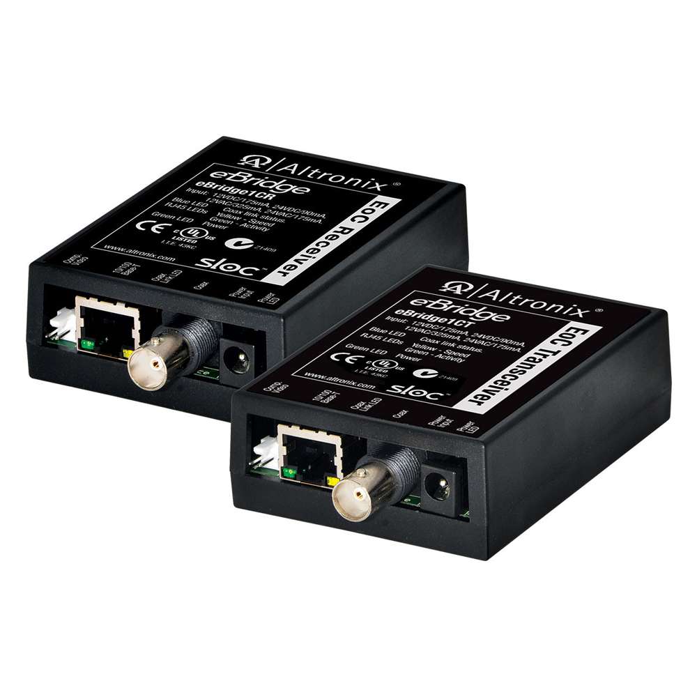 Altronix EBRIDGE1CRT Series IP over Coax transceiver and receiver kit is designed to enable fast 10/100Base-T Ethernet digital communication over coax cable. These plug and play units facilitate system upgrades from analog to IP camears/devices utilziing existing legacy Coax and eliminating the costs and labor associated with installing new network cabling. In addition, data transmission is extended up to 610m (over five times the 100m Ethernet maximum legnth), elminating the need for repeaters. eBridge units transmit composite video signal with Ethernet data simultaneously.