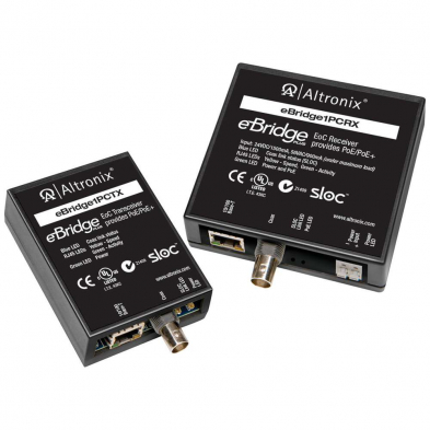 Altronix EBRIDGE16PCRX Series single port EoC Receiver and hardened Transceiver kit transmits data and power over coax cable. eBridge1PCRX generates PoE/PoE+ up the coax to an eBridge1PCTX transceiver. The transceiver, in turn, delivers that PoE compliant power to an edge device/camera. These plug and play units faciliate system upgrades from analog to IP utilzing existing legacy Coax and eliminate the costs and labor associated with installing new network cabling. Data transmission and power over the Coax is possible up to 500m in comparison to 100m Ethernet distance (CAT5e). A maximum range from headend to the edge device/camera is 700m, taking into consideration that up to 100m of structured cable may be deployed from the receiver to the network switch and the transceiver to the edge device/camera.