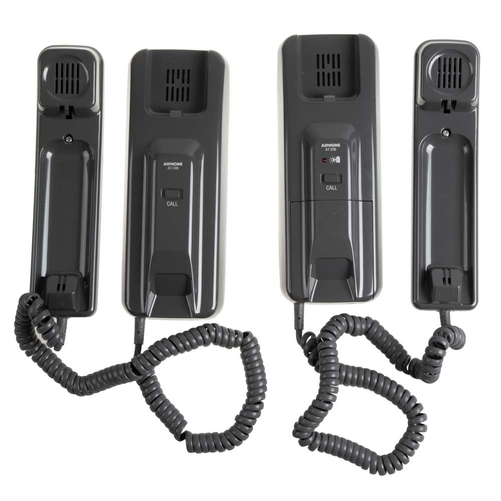 The AT-406B-A Handset to Handset Boxed Set contains a master and sub handset. Handsets are charcoal gray in color and can call and communicate with each other. Coil cord on each unit is 4'. System can be powered by either a six volt DC power supply (SKK-620) or by using 4 AA batteries. System requires two wires between handsets.