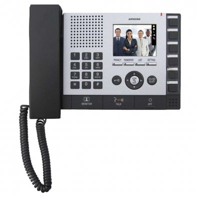 The IS-MV is a video master station with a 3.5 color LCD monitor. It can be wall or desk mounted (desk stand included). The IS-MV offers handset (duplex) and hands-free (VOX/PTT) communication and can page up to 5 zones simultaneously. It connects to the IS-CCU or IS-SCU using CAT-5e/6 cable and is powered by the system.