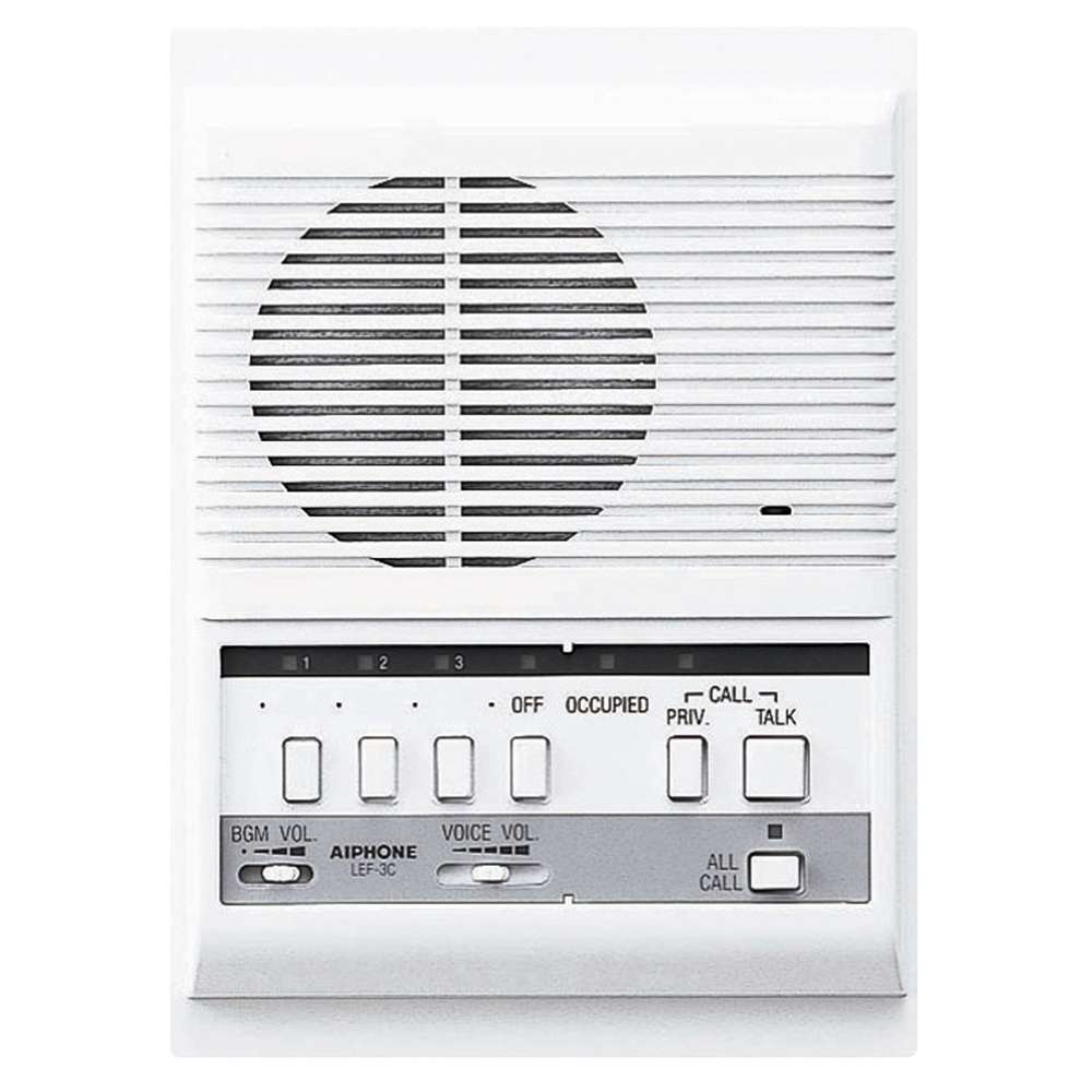 The LEF-3C is a selective calling open voice style master station, used to answer calls from other remotes or masters. The system can be designed to include any combination of master and sub stations. The LEF-3C can be part of a larger system with the ability to communicate with three other stations, plus make an All Call and/or recieve background music. The LEF-3C flush mounts into a wall.