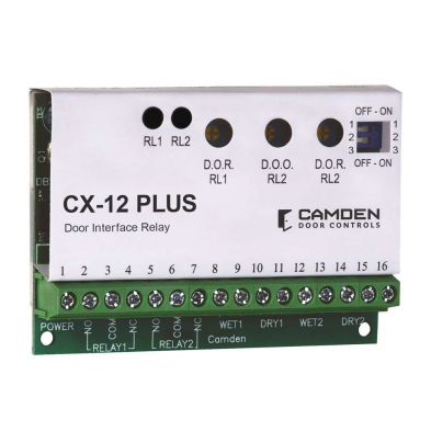 The Camden CX-12PLUS Door Interface Relay is an economical solution for interconnecting automatic doors with access control, fire alarm and time systems.