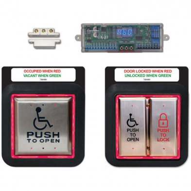 The Camden CX-WC13AXFM is a push restroom control kit with a 'Push to Lock' button as well as an 'Occupied When Lit' single gang LED indicator. The kit consists of a CX-33 advanced logic relay controller, a CM-2520/4855SE1 Combo switch, 2 x 4 'PUSH TO OPEN' & 'PUSH TO LOCK', Flush mount AURA™ illuminated enclosure and sign, a CM-45/455SE1 4-1/2 Push Plate switch, wheelchair & 'PUSH TO OPEN' with Flush mount AURA™ illuminated enclosure and sign, a CX-ED2079 Grade 2 ANSI electric strike with 3 faceplates, and a CX-MDA magnetic door contact.