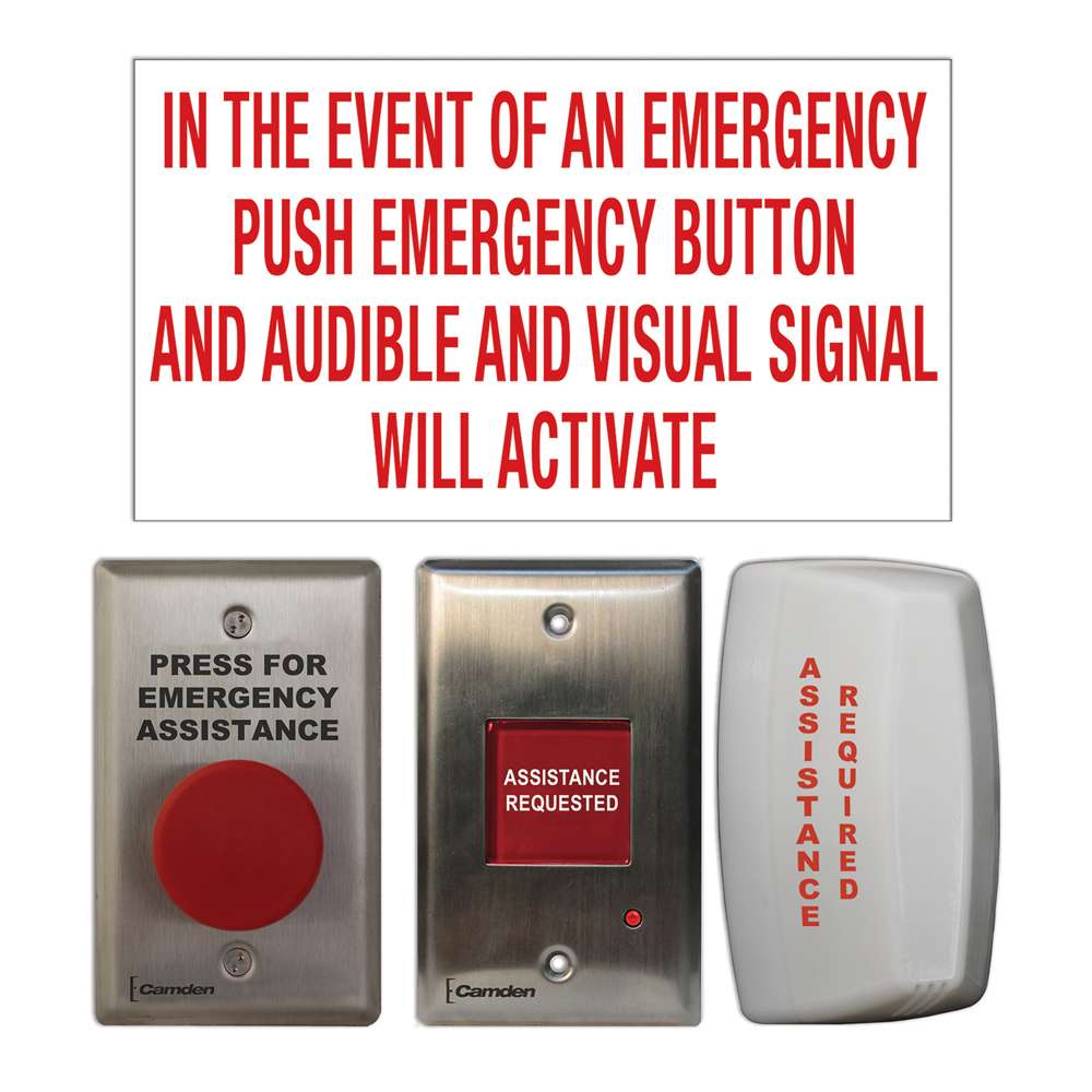 The kit includes 1 'PRESS FOR EMERGENCY ASSISTANCE' mushroom push button, 1 LED dome light with adjustable sounder, LED annunciator with adjustable sounder and 1 white panel sign measuring 6 x 10-5/8.