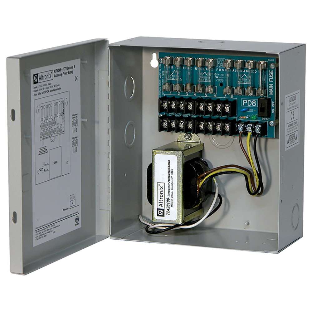 Altronix ALTV248 Series CCTV power supplies provide 24VAC or 28VAC distributed via eight (8) fuse or PTC protected outputs for powering CCTV cameras, heaters, and other video accessories.