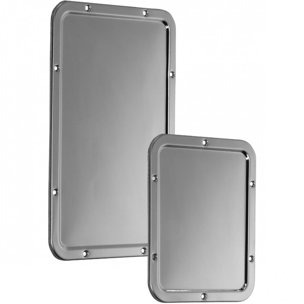 One-piece stamped stainless steel mirror with raised frame. Engineered and suitable for continuous daily use in an intensive use environment. 18 gauge, type 430 stainless steel. Mirror surface highly polished.