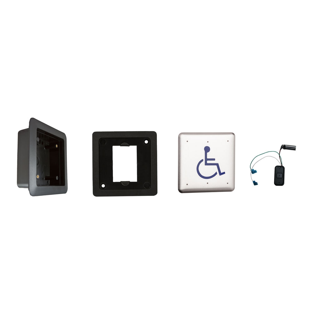 4.75 Inch x 4.75 InchSquare Design. Universal Wheelchair Accessibility Logo and "Push To Open" Text. Can mount in a flush box, surface box, bollard post, or standard single gang electrical j-box. Vandal resistant and Weather resistant.