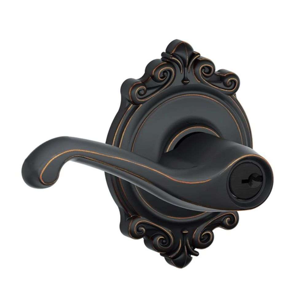 The Schlage Flair is a Grade 2 lever that is part of the Schlage F-Series Collection. The ornate details give the lever a dramatic bit of- yes, flair.