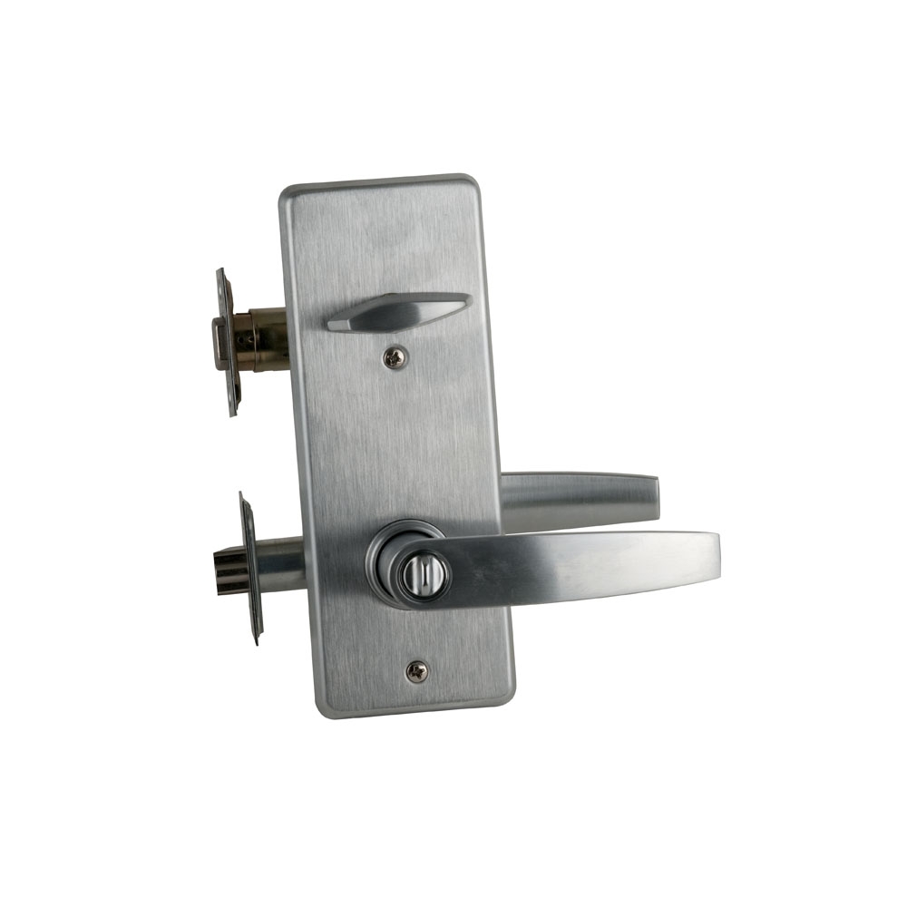 - Entrance, double locking - Deadbolt operated by key from outside or by turning unit from the inside. Bolt automatically deadlocks when fully thrown. Outside lever is unlocked by key from the outside or by turn-button on inside lever. Turn inside lever to simultaneously released deadbolt and latchbolt for immediate exit. Latch automatically deadlocks when door is closed.