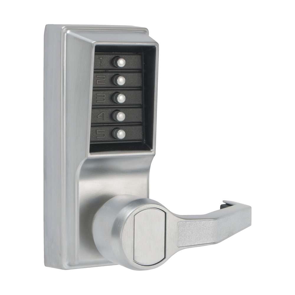 Simplex Mechanical Pushbutton Locks eliminate problems and costs associated with issuing, controlling, and collecting keys and cards. The Simplex L1000 Series provides exterior access by combination, while allowing free egress. This mechanical lock, with lever option, eliminates the material and labor expense of battery replacements, has a single access-code and is programmed via the keypad without removing the lock from the door.