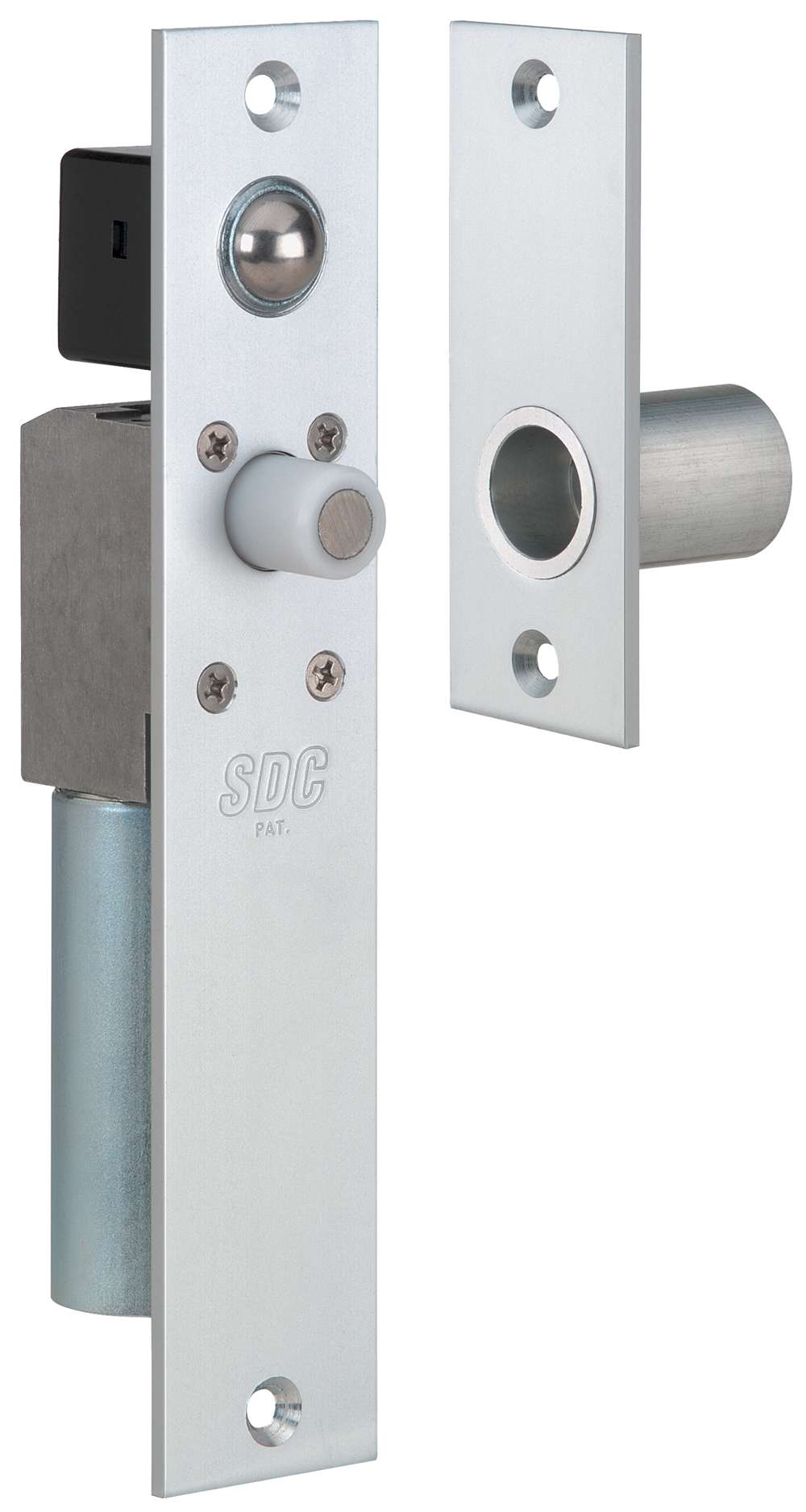 FS23M locks are equipped with nylon bolts with hardened magnet cores, specification grade solenoids and automatic relock ball switches. Bolts rotate freely, making attempts to tamper or cut extremely difficult. Specification grade solenoids facilitate superior overall performance in both force and longevity, when compared to commercial grade solenoids. Automatic relock ball switches keep the bolt retracted while the door is open. The door depresses the ball switch on closure, causing the bolt to project automatically, locking the door. Additionally, ball switches are field adjustable to compensate for wide door gap and bidirectional to permit use on swinging and sliding doors.