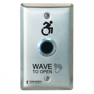 ValueWave hands free switches are both water resistant and offer a built-in light ring standard ; CM-221 for red/green or CM-222 for blue/green illumination. Camden ValueWaveâ„¢ 12/24 VDC touchless switches with 1 relay are IP 65 rated for indoor/outdoor use, ideal for use in automatic door/access control systems. These switches are designed for easy installation and trouble-free service in high traffic applications. CM-221 are available in single, narrow and double gang stainless steel faceplates and graphics.