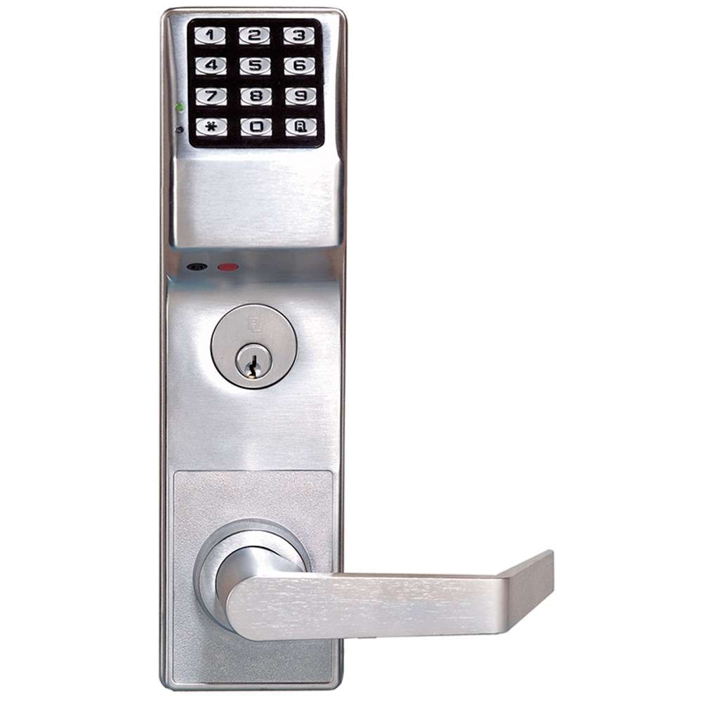 Alarm Lock's ETDlS1G-26DC50 Pushbutton Exit Trim is a straight lever exit trim with a generic rim cylinder (Schlage C Keyway) and adaper kit that works with most major manufacturer brands of standard RIM and IC RIM cylinders. The device is nonhanded and fully field reversible. To operate, a clutch mechanism permits the turning lever without retracting the latch. This reduces stress on the spindle. The access code entry allows the lever to retract the latch, and an inside panic bar provides instant egress.