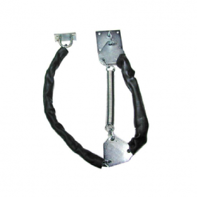 Galavanized steel butt welded chain. Para-rubber chain covering. Galvanized extension spring, approximately 8" long. 3" by x 3" galvantized staple plate for securing to door with the included thru bolts. 1 3/4" x 2 1/2" galvanized staple plate for fastening to door frame with included hardware. Chains are individually poly bagged.