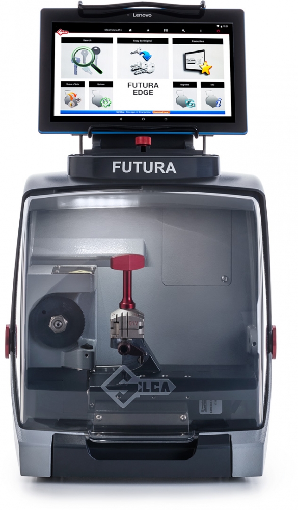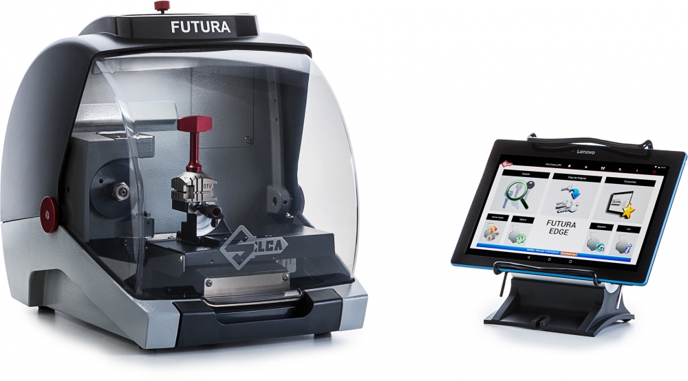 Controlled by a removable 10” touch-screen tablet, the Futura Edge guides the user step-by-step in all key cutting operations: for example, in selecting the make, model and year for automotive keys, in the choice of the right clamp, how to load the key, etc.