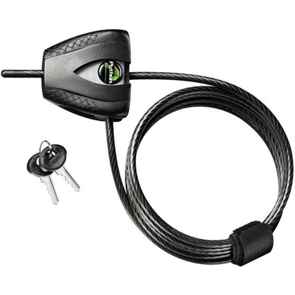 The Master Lock No. 8417D Python™ Adjustable Locking Cable 6ft (1.8m) long and features 3/16in (5mm) diameter braided steel for maximum strength and flexibility. The protective vinyl coating protects against scratches. The integrated pin tumbler keyed locking mechanism provides superior pick resistance. The rust resistant lock and vinyl coated cable provide superior weather and scratch resistance. The Limited Lifetime Warranty provides peace of mind from a brand you can trust.